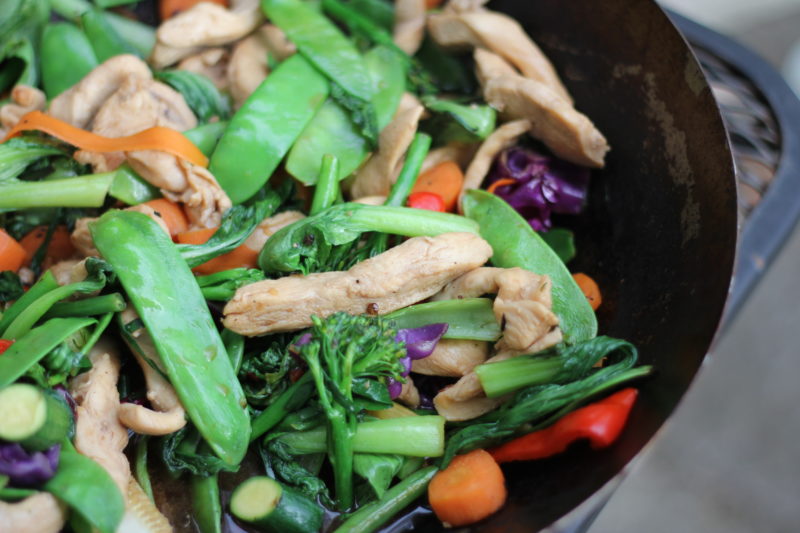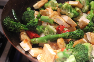 - Prepare the protein by stir frying in a glaze of hot oil until browned and chicken is cooked, set aside
