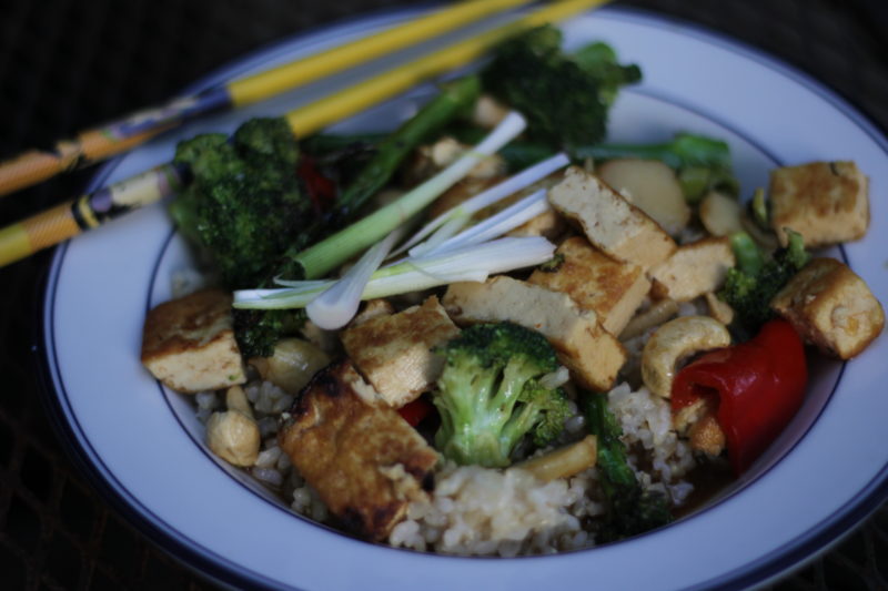 - Protein: Strips of Chicken, Chunks of Firm Tofu, Cashews