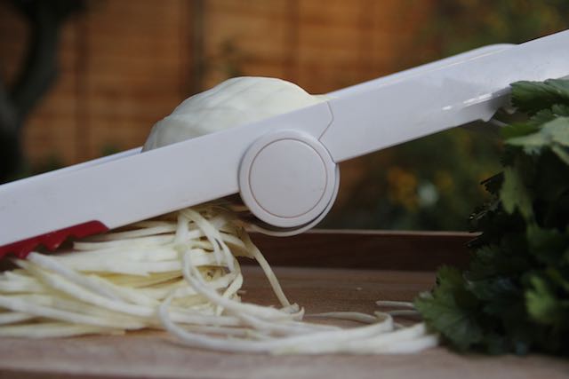 - 1/2 head of cabbage, red or green, sliced thin on a mandoline