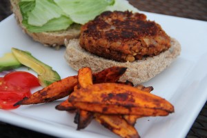 These Burgers are a snap to make when you use the VitaMix. Save a big scoop of Pinto Pot Beans to use as a the base for these hearty Veggie Burgers. You can serve them up with a whole wheat bap (that’s a bun for you Americans) and classic burger toppings or serve them topped with Salsa and Roasted Red Pepper Sauce. I like a sprinkle of smoked cheddar cheese and sliced avocado.