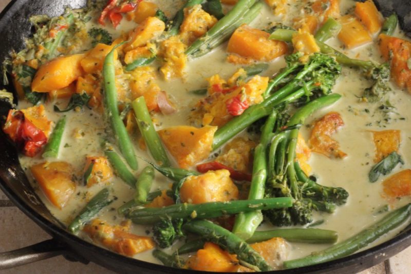 Freeze extra curry paste to have on hand for Thai Fish Cakes or Stir Fry. You can use a variety of Vegetables: sweet potatoes, zucchini, carrots and green or yellow peppers are all good.