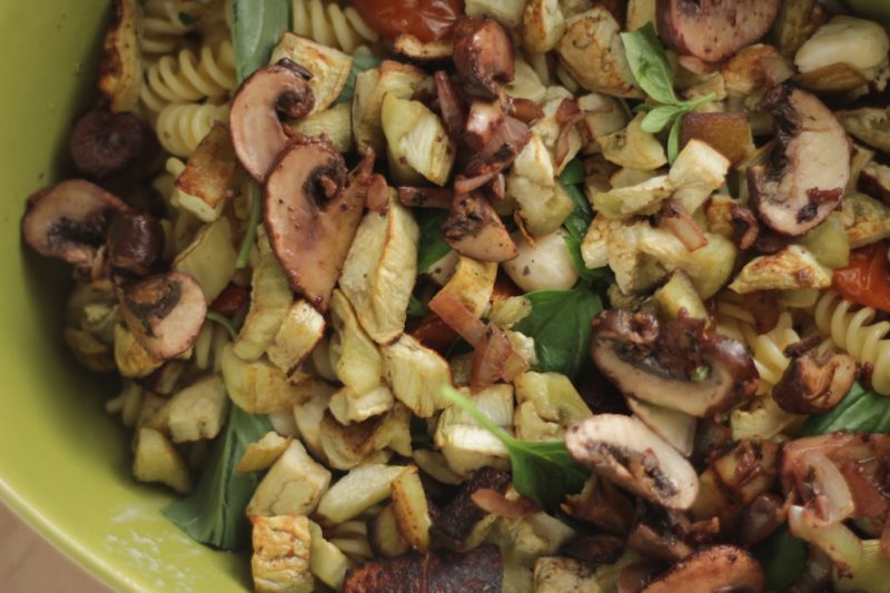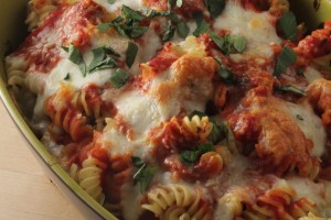 This is a fast, gotta get dinner out before the kids go insane kind of recipe. Serve it up with a simple salad. You can add chicken for the meat eaters. I make one big batch and toss chicken and cheese into one casserole dish and leave the other with just veg and lots of sauce. I use Seeds of Change Tomato and Basil Sauce but you can whip up a good sauce with a splash of olive oil, salt, pepper, oregano and crushed tomatoes in about 10 minutes while the pasta cooks. Cook the pasta very firm so it doesn’t get mushy in the oven. You can roast other veg and toss it in. Broccoli, tomatoes or zucchini all work well here.
